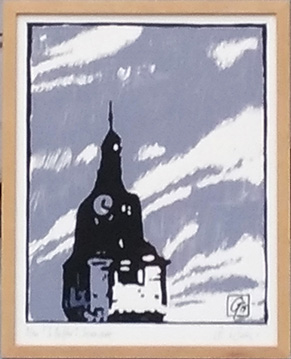 « Beffroi Concarneau » 2015 Sérigraphie 3 couleurs, numérotée, signée, tirage 100 exemplaires, cadre chêne,39 x 31 cm 50 €. Sans cadre 40 €.
