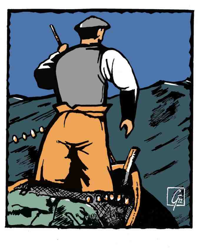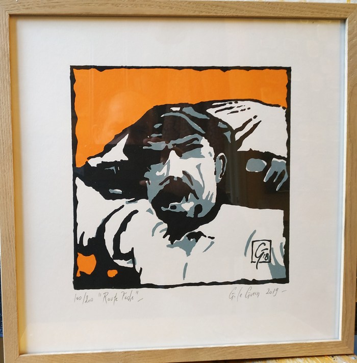 « Route pêche » 2019 – Sérigraphie 3 couleurs , numérotée , signée, cadre bois noir, tirage 100 exemplaires, 25 x 27 cm 70 €/pièce, sans cadre 50 €.