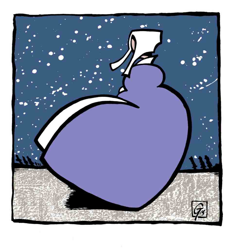 « L’attente» 2024 – Sérigraphie 2 couleurs, numérotée, signée, format 29 x 34 cm, tirage 100 exemplaires, cadre chêne 80 €/ pièce. Sans cadre 60 €.